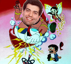 Ecco il nostro grande amico uscire dalla lampada lasciando la scia, proprio come io vi lascio la firma mia. Egli è un mago dagli enormi poteri...Yuri Cherchi, Cherchi Yuri e fa sparire, in men che non si dica, una cassetta d'uva (perchè non fa ingrassare), mezzo ciobbo di salsiccia (SARDA), due brocche di caffè. |
